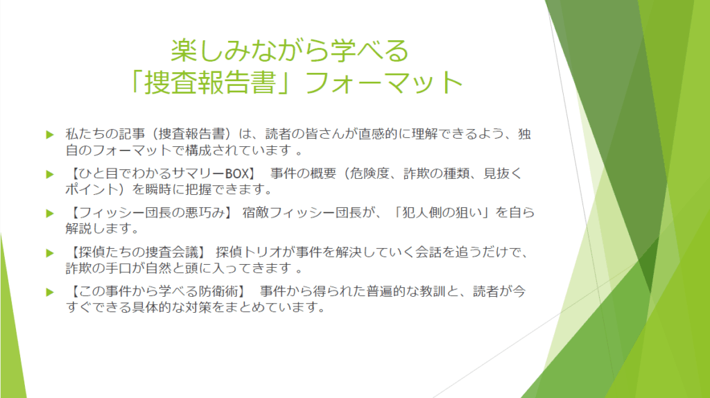 • 「今回の手口は、過去の〇〇詐欺とここが似ている」「犯人はこういう心理トリックを使っている」など、その記事固有の分析が書かれています。